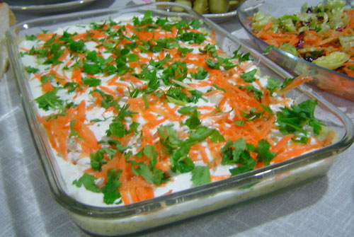Bir tencerede 8-10 adet iri patatesi kabuklu bir şekilde haşlayınız. Daha sonra patatesleri ufak bir şekilde doğrayınız. Üzerine kıyılmış dereotu, rendelenmiş havuç ve tuzda dövülmüş sarımsağı ekleyiniz. Hepsini yoğurtla karıştırınız ve afiyetle yiyiniz.